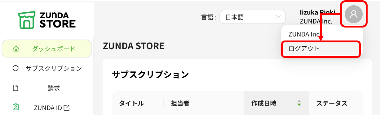 ZUNDA STORE にログインした状態で、ZUNDA STORE 右上のメニュー (ユーザーアイコンが表示されている場所) をクリックし、[ログアウト] を選びます。