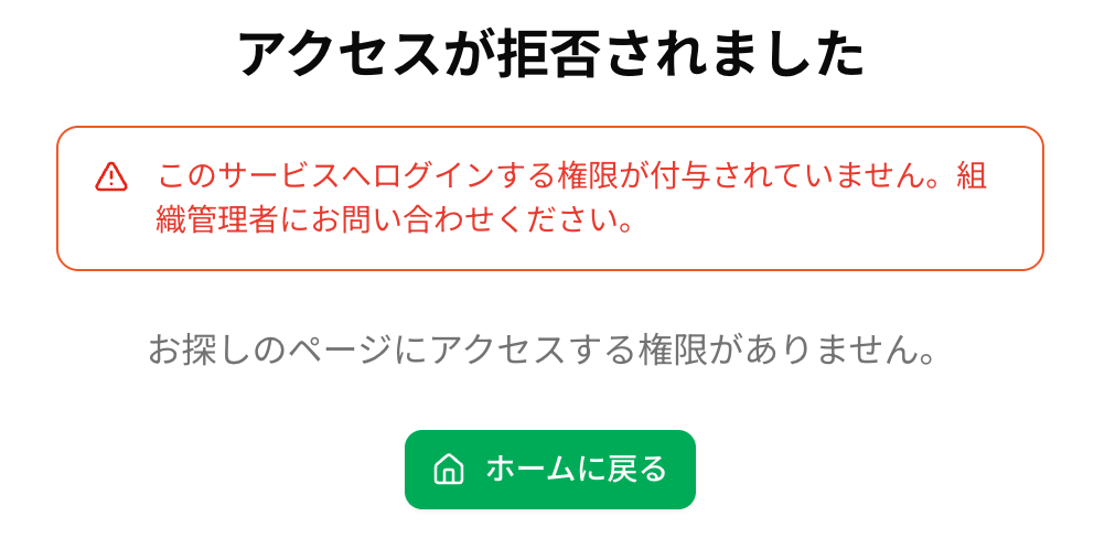 以下のような画面が表示されログインできない場合は ZUNDA ID でログインに失敗したユーザーが所属するグループに利用権限の付与が必要です。