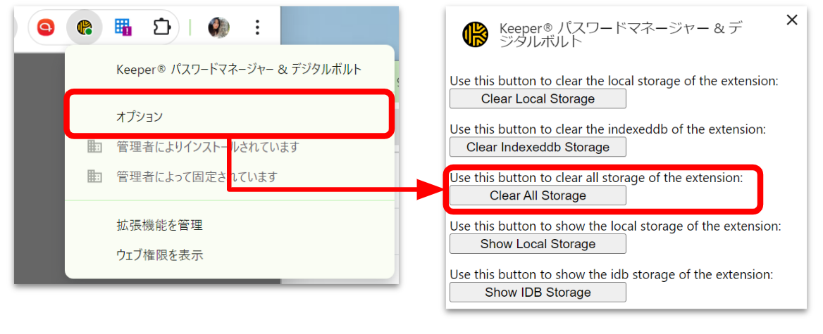 Keeper の拡張機能のアイコンを右クリック>オプション>[Clear All Storage] を実施。