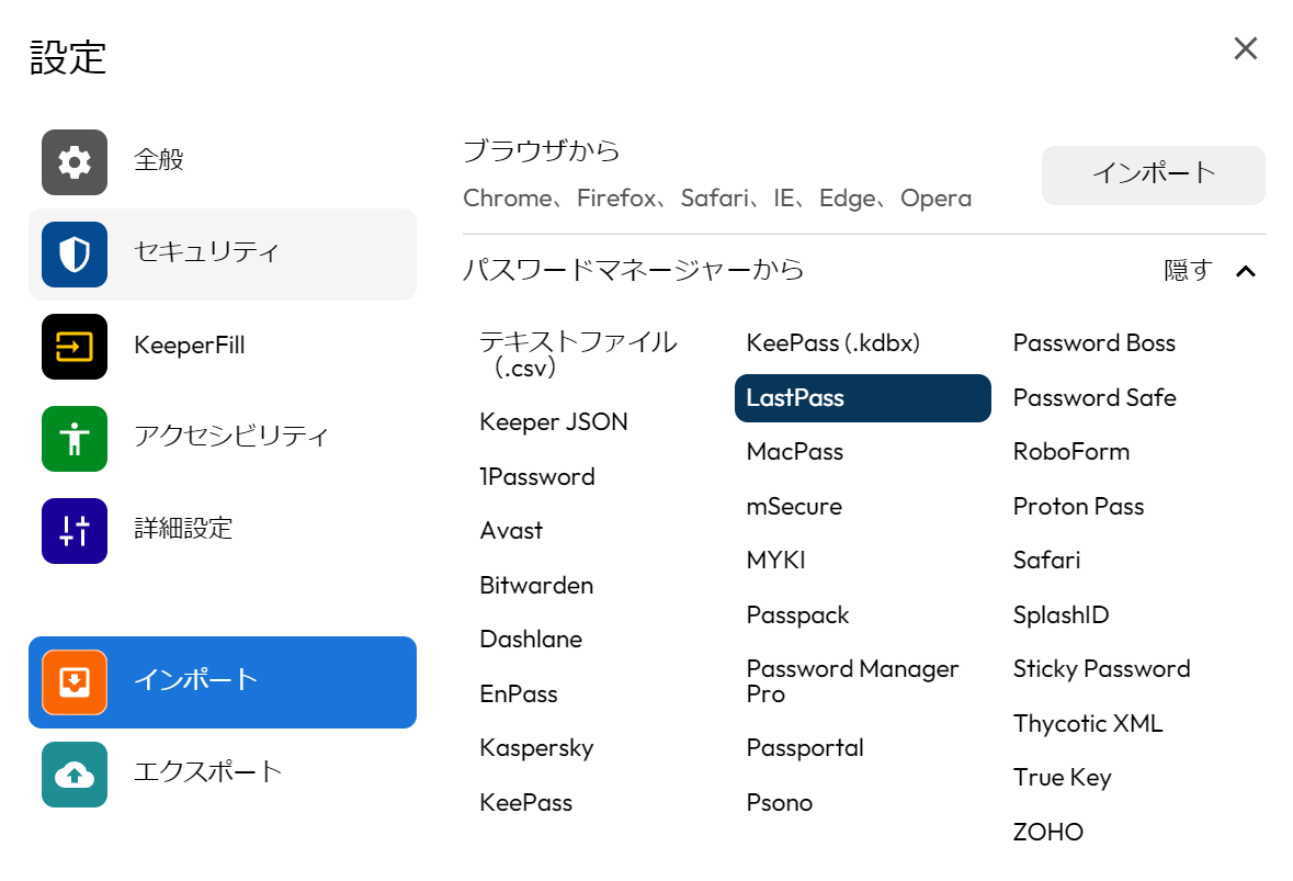 - 「インポート」「LastPass」を選択します。