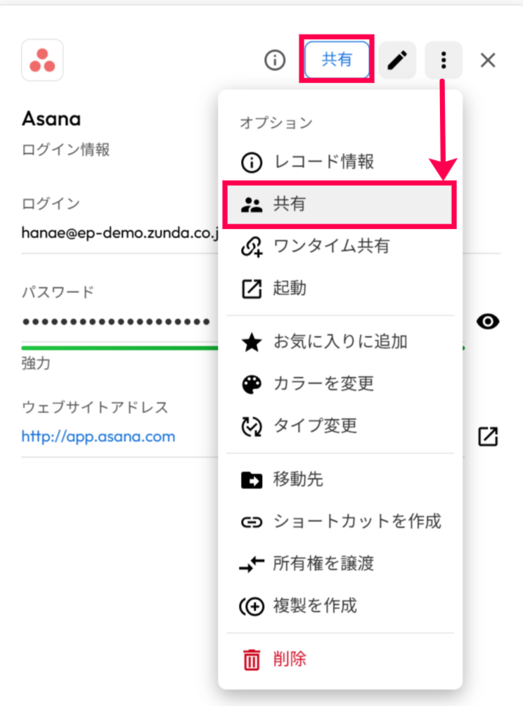 ※管理者がロール(強制ポリシーの設定)で、ワンタイム共有を禁止している場合もあります