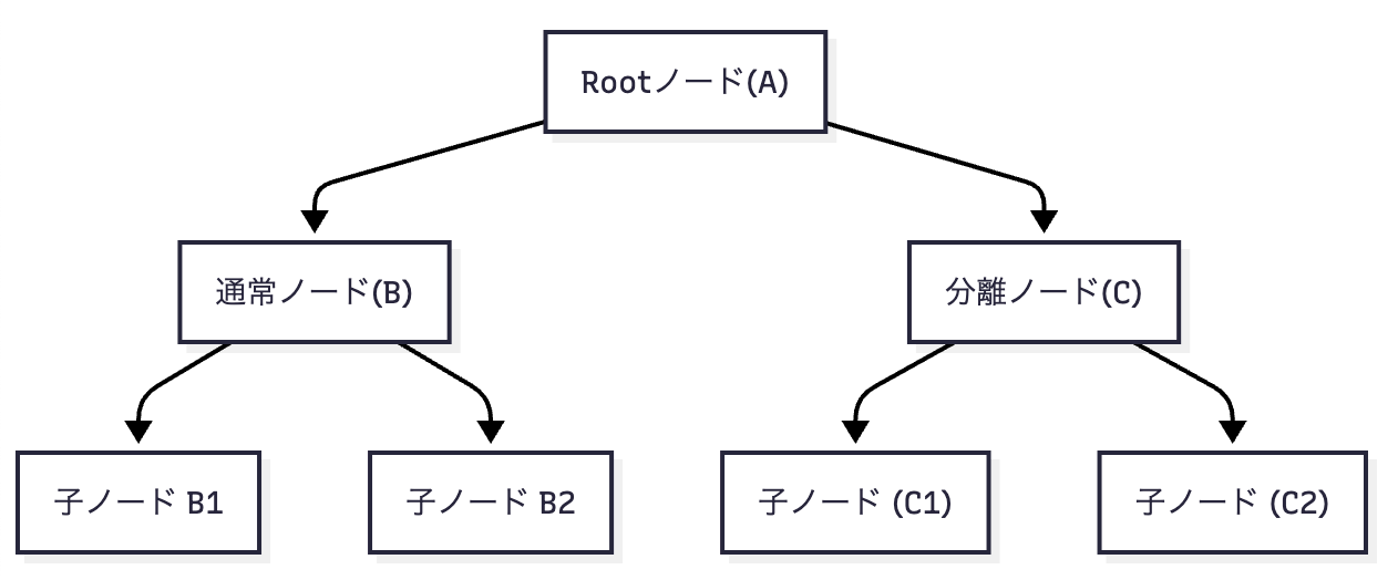 - 「分離ノード(C)」とその子ノードは、親ノードである「Rootノード(A)」と「分離ノード(C)」と子ノードに共有できます。