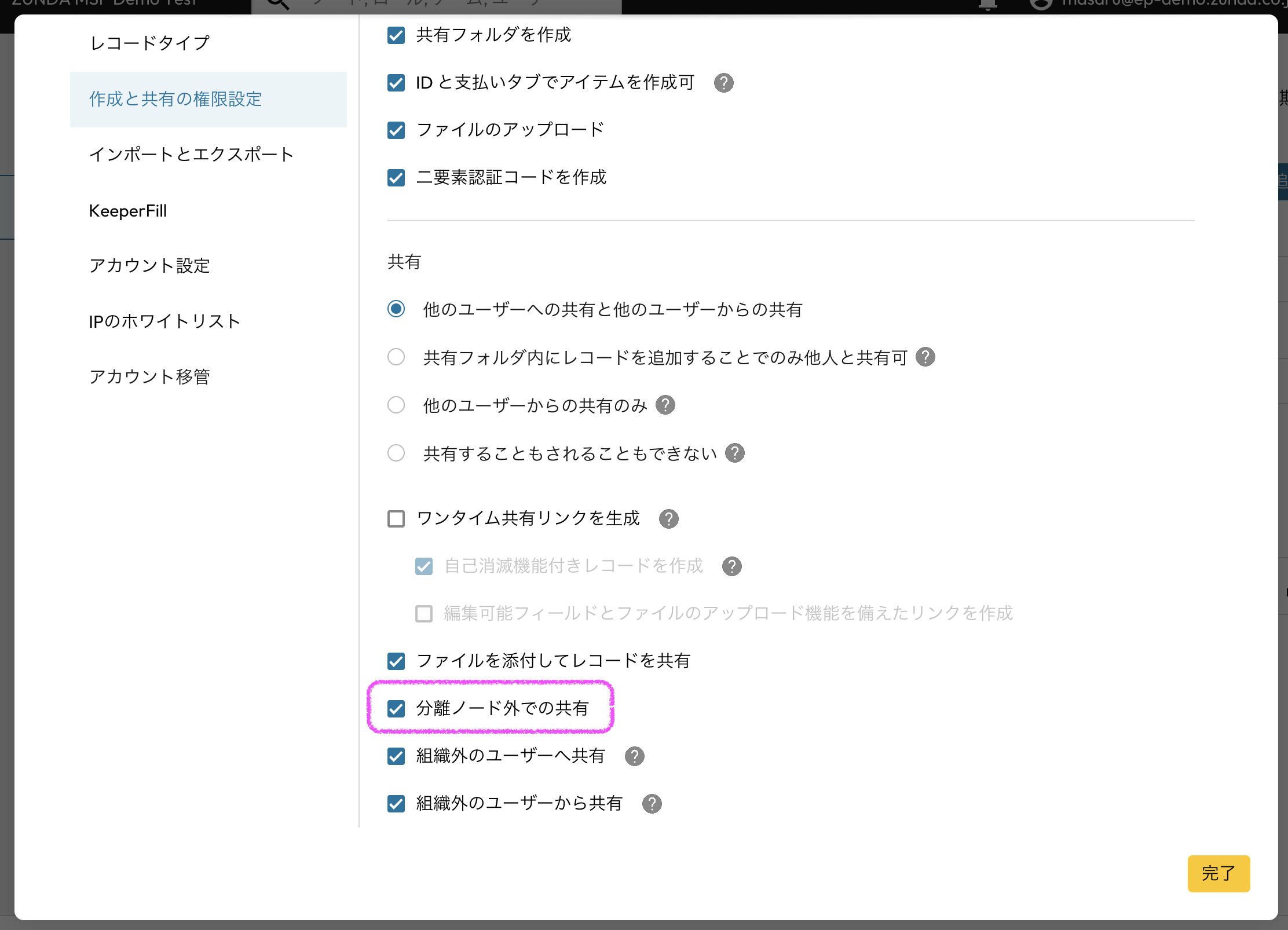 分離ノード外への共有を拒否するには、先ほどのKeeper Commander (CLI)での enterprise-node --toggle-isolated コマンドを行った後に、ロールの強制適用ポリシーの、「作成と共有の権限設定」にある「分離ノード外の共有」をOffにしてください。