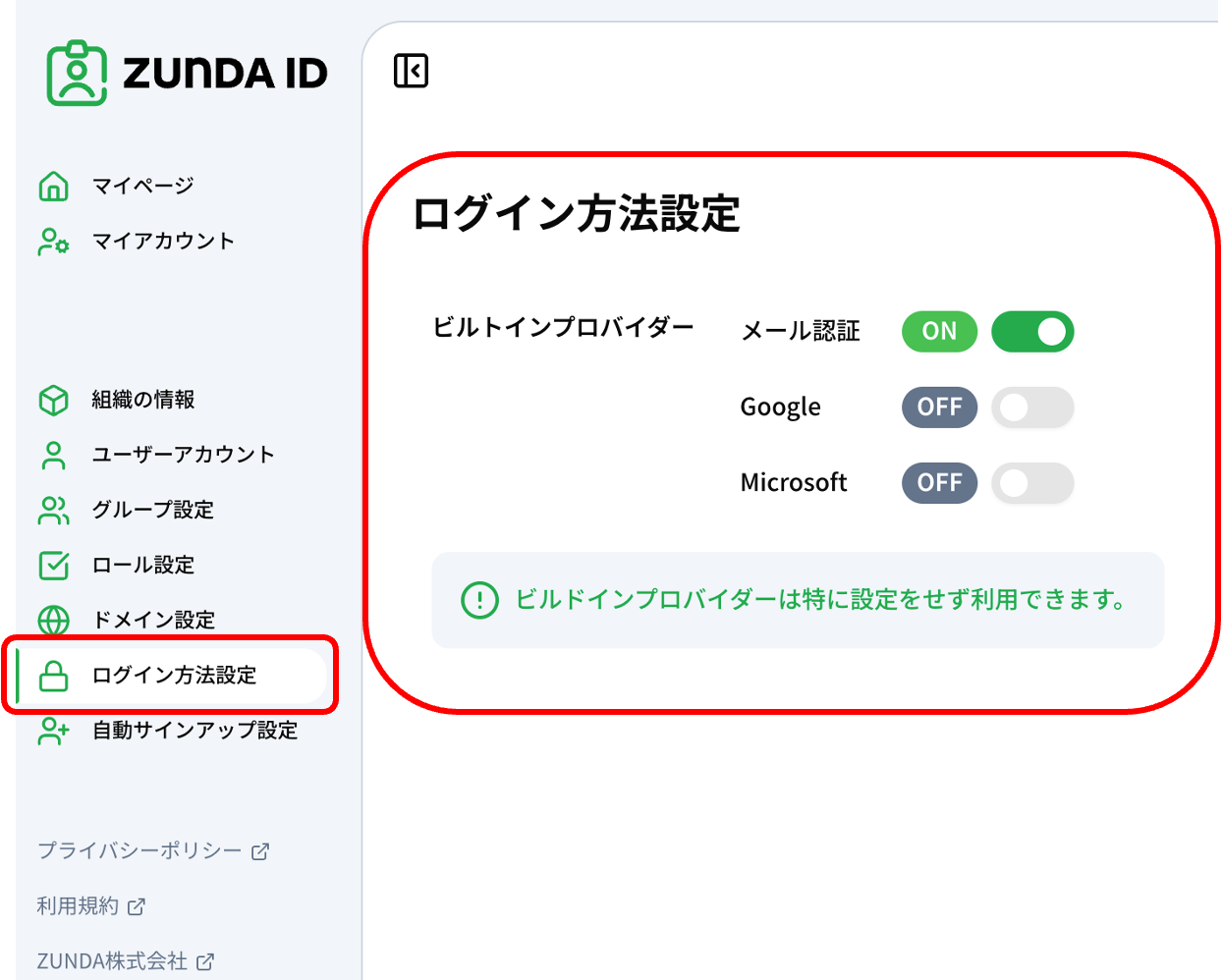 メニューの [ログイン方法設定] をクリックすると、組織で利用できるログイン方法を設定できます。