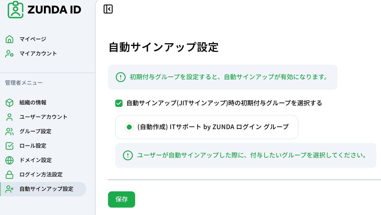 メニューの [自動サインアップ設定] を押下すると、設定画面に遷移します。※既定値では自動サインアップは「(自動作成) ITサポート by ZUNDA ログイングループ」に設定されています。