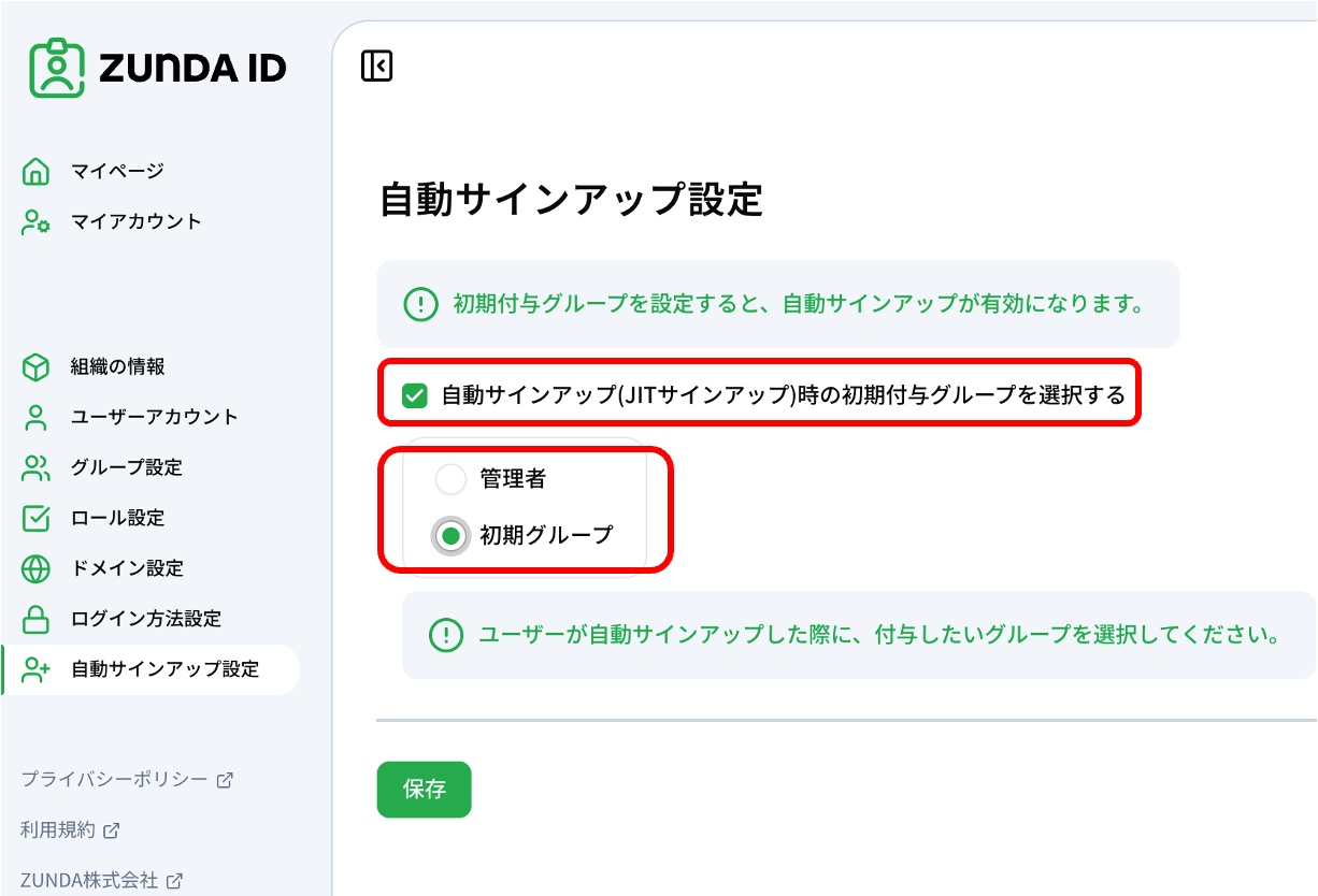 [自動サインアップ(JITサインアップ)時の初期付与グループを選択する] にチェックを入れ、初期グループを設定し [保存] をクリックします。