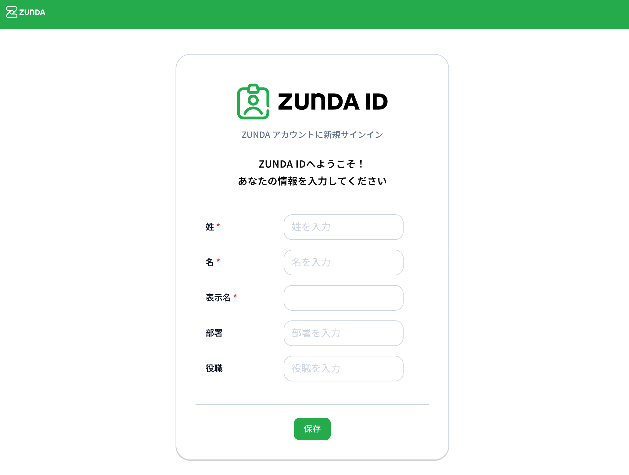 自動サインアップを有効にした後、組織に登録されていない且つ、組織に設定されているドメインのメールアドレスでログインを試すとユーザー情報を入力する画面に遷移します。