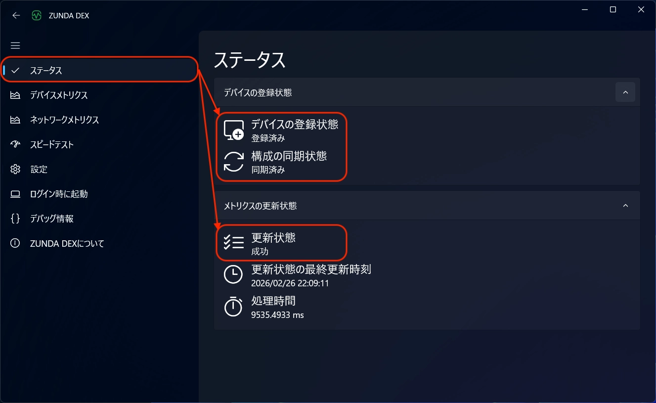 ※参考情報: ZUNDA ID のログイン ZUNDA ID スタートガイド - ZUNDA ID ログイン後、ZUNDA DEX クライアントのウィンドウ左ペインから [ステータス] をクリックし、以下の状況になっていればログイン完了です。