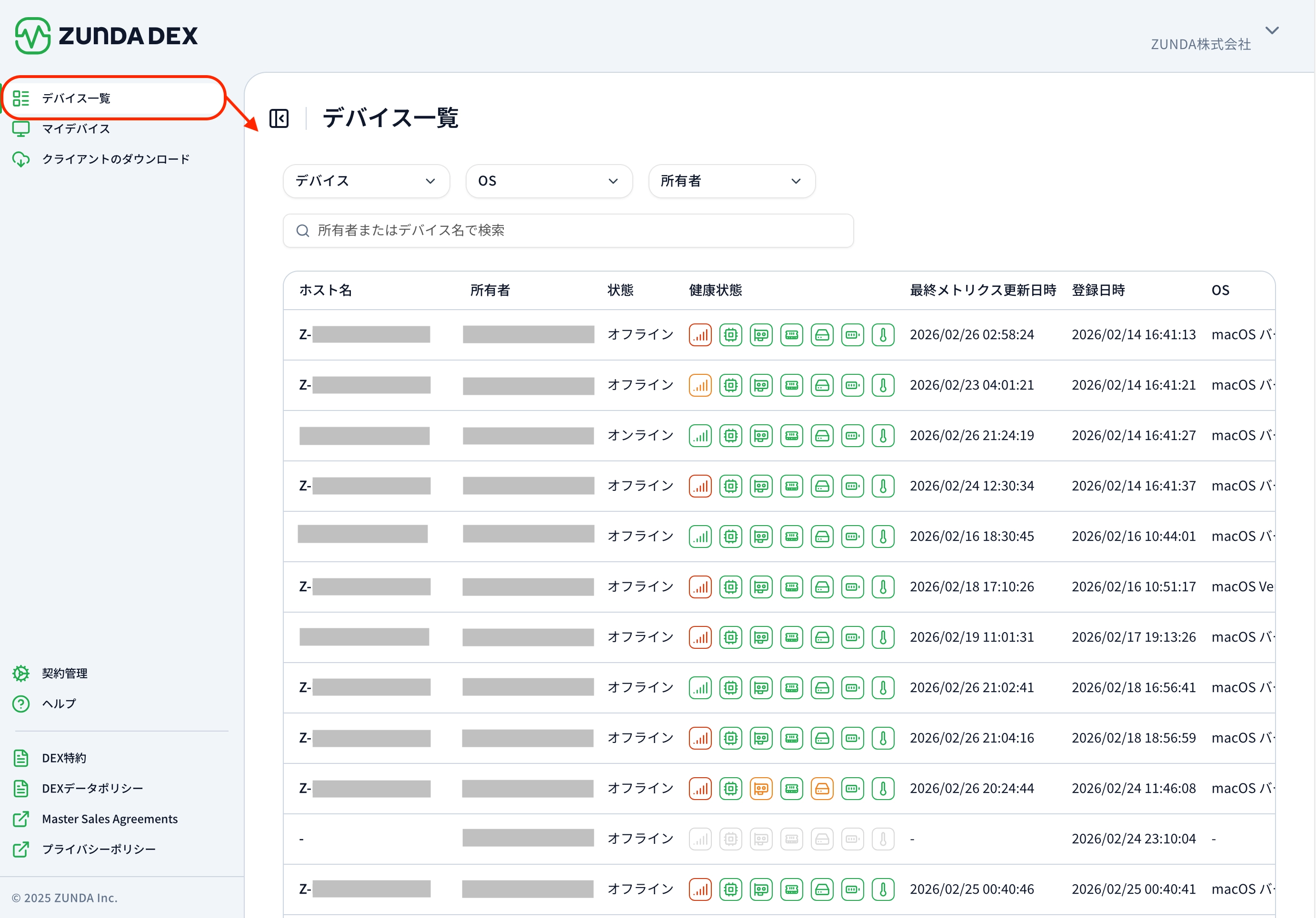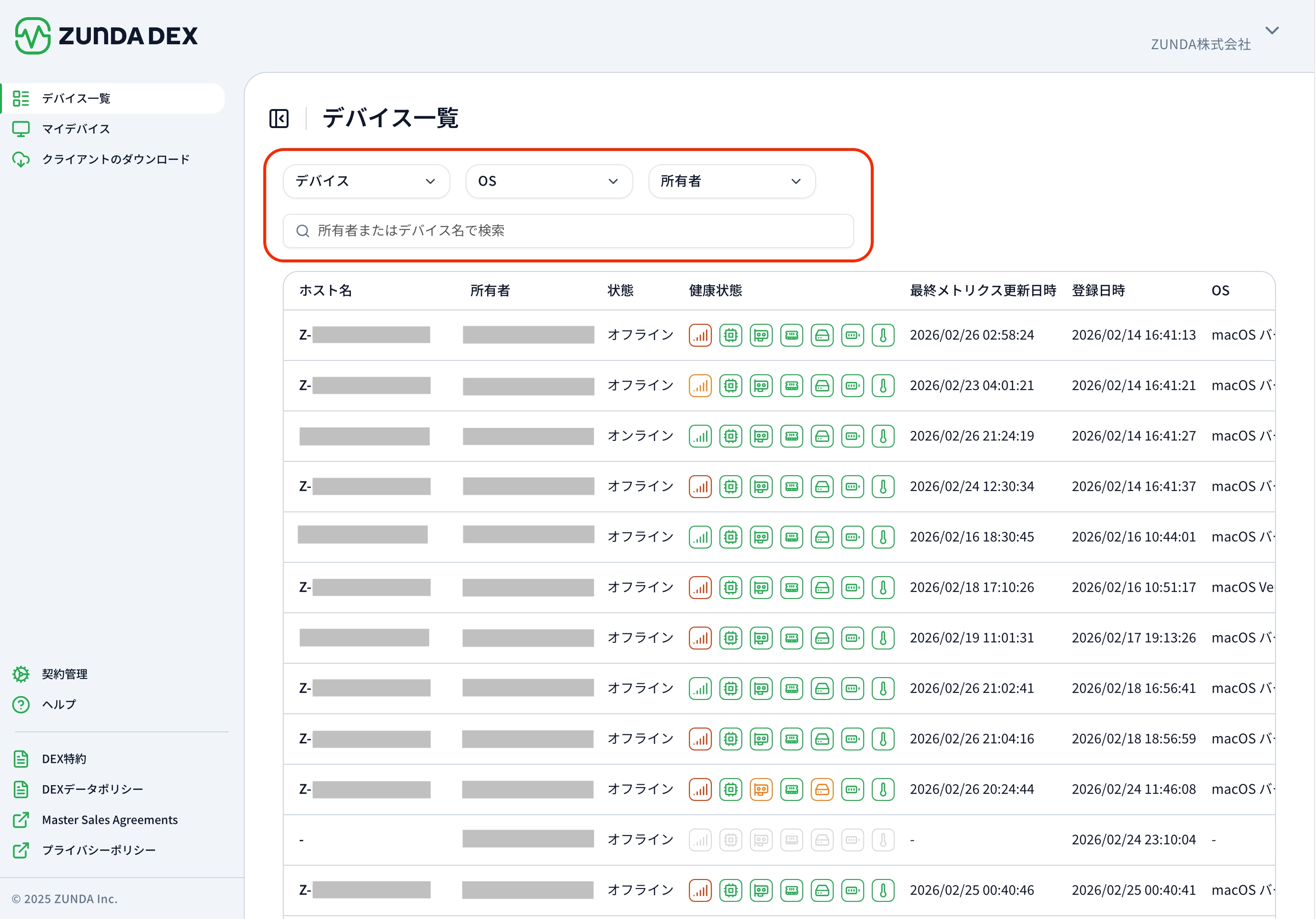 - 登録日時: デバイスがZUNDA DEX 上の組織に登録された日時 7. OS: デバイスで登録している OS とそのバージョン