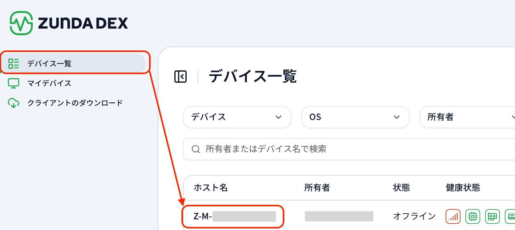 左ペインから [デバイス一覧] をクリックし、一覧画面から対象のデバイスのホスト名をクリックします。