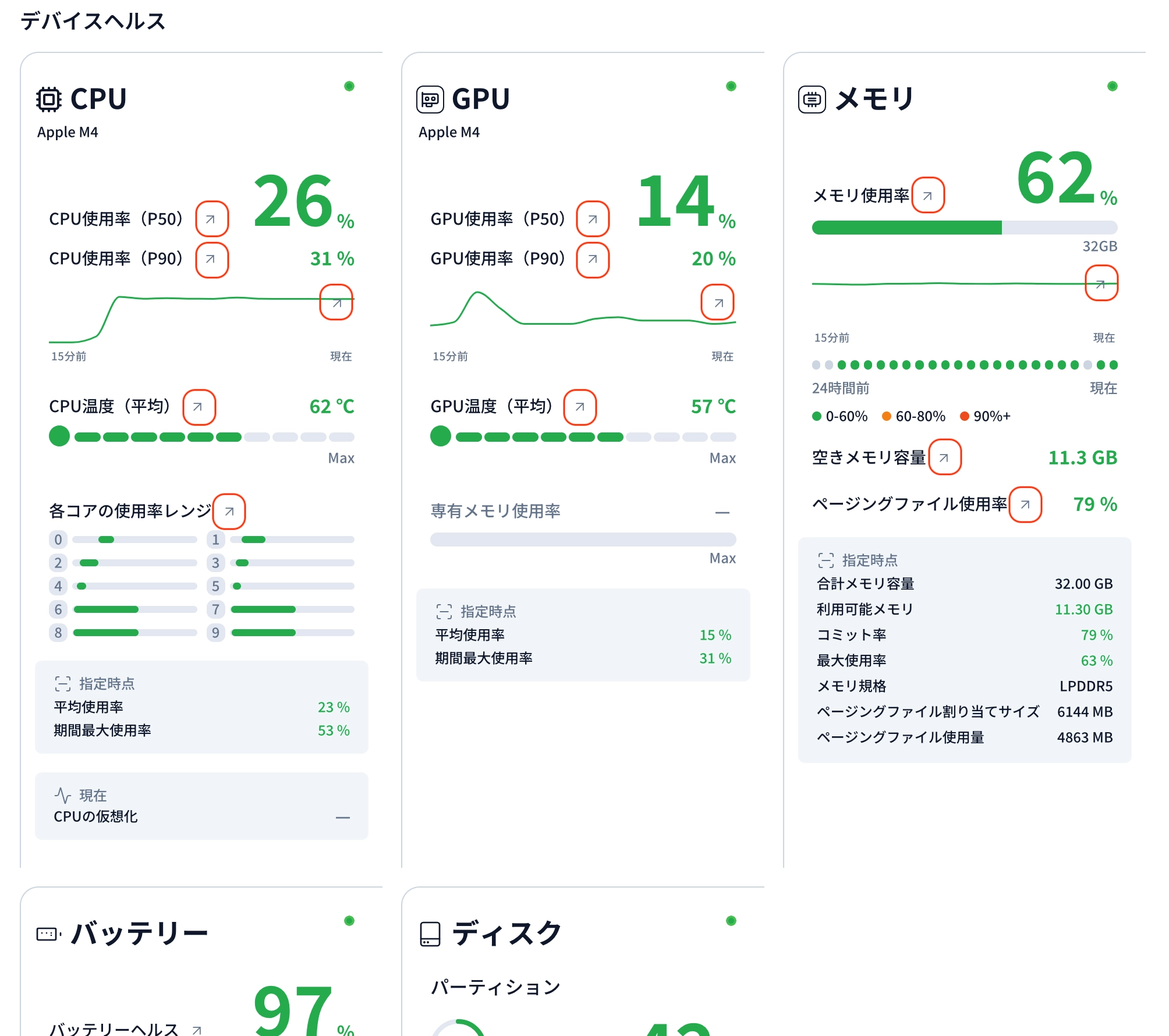 - 健康状態: 左からネットワーク状況、CPU、NIC、メモリ、ディスク、バッテリ、温度の健康状態です。緑色が健康、黄色は注意、赤色が対処をおすすめする状態です。