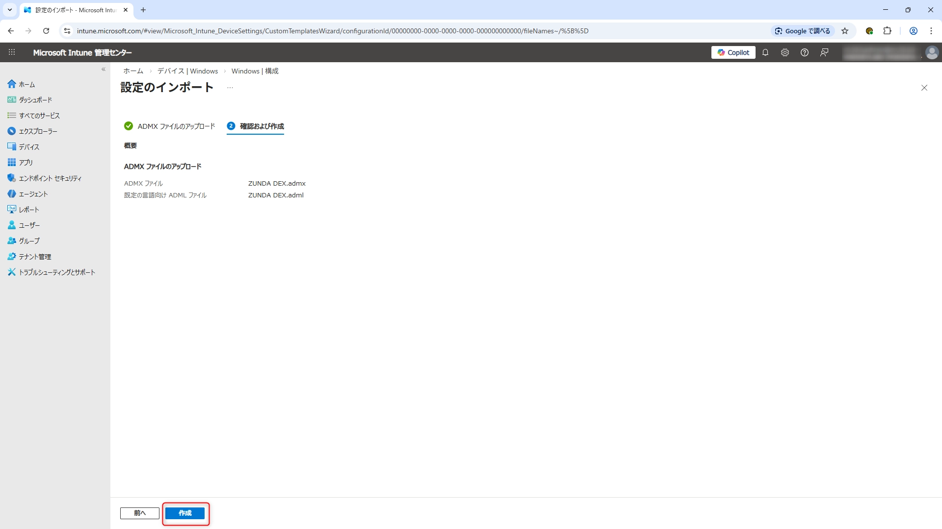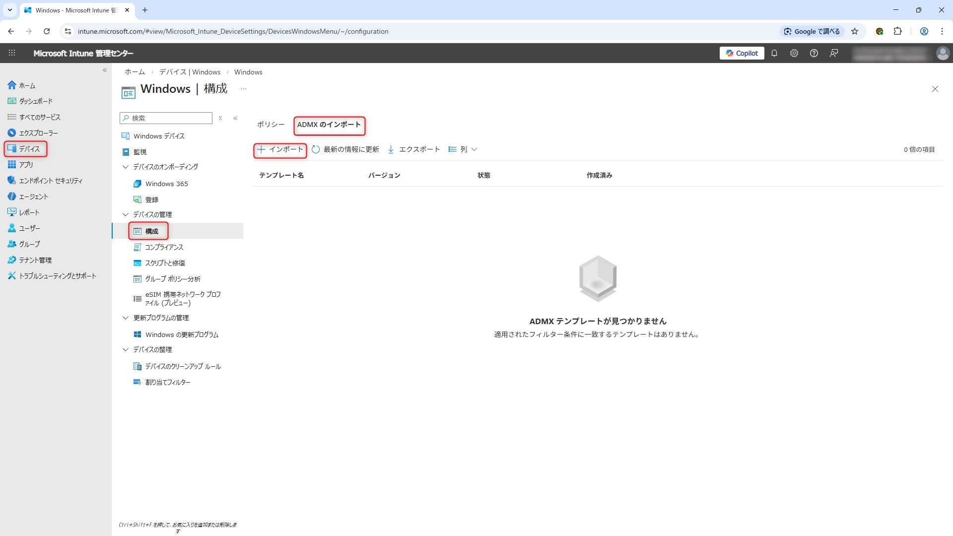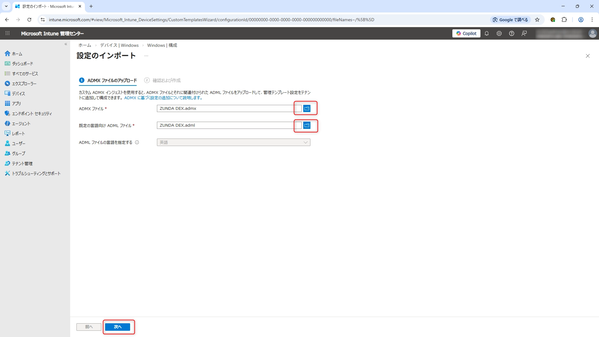 - デバイス >(プラットフォーム別)Windows > (デバイスの管理)構成 > ADMXのインポート > インポート をクリックします。