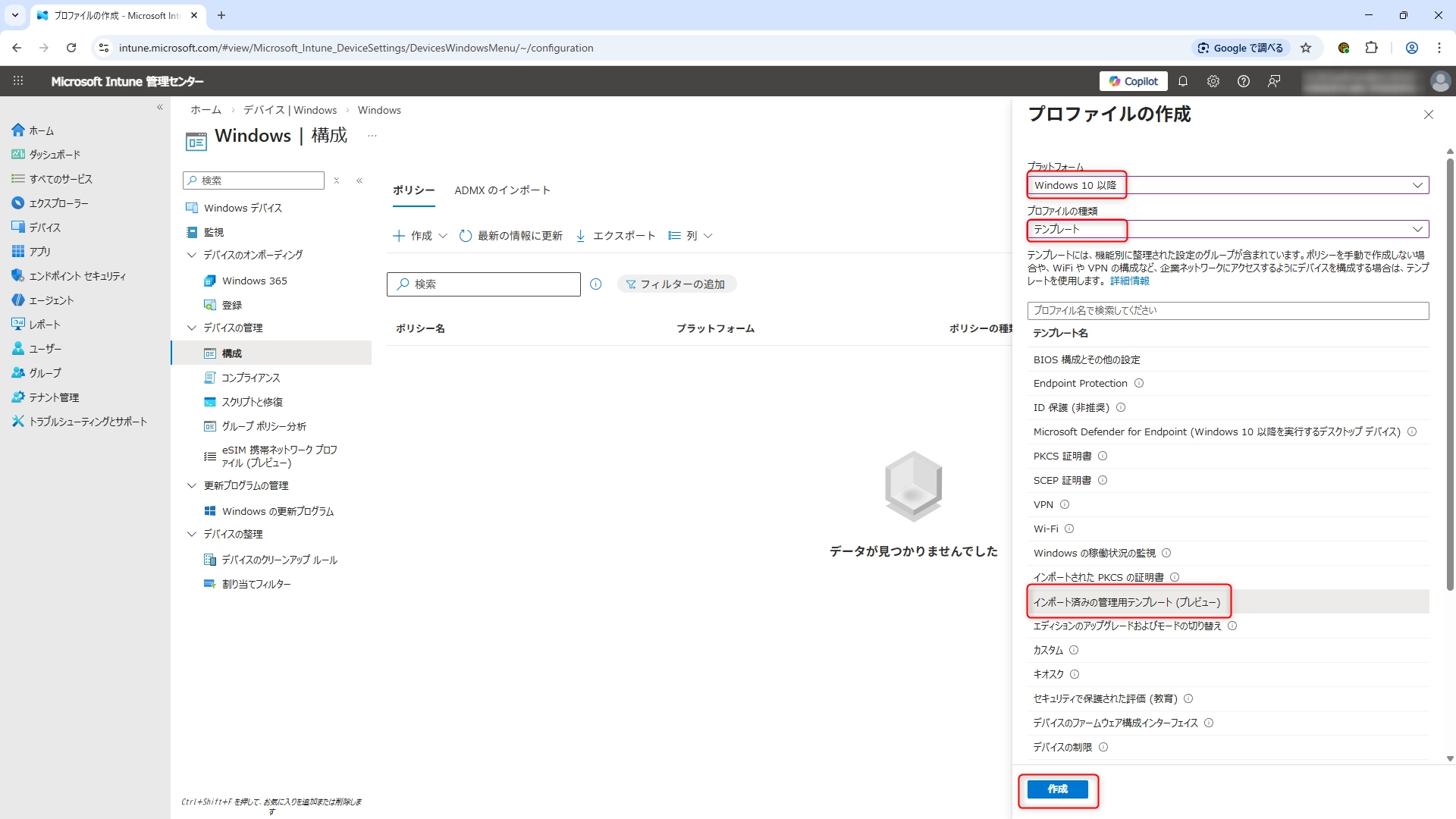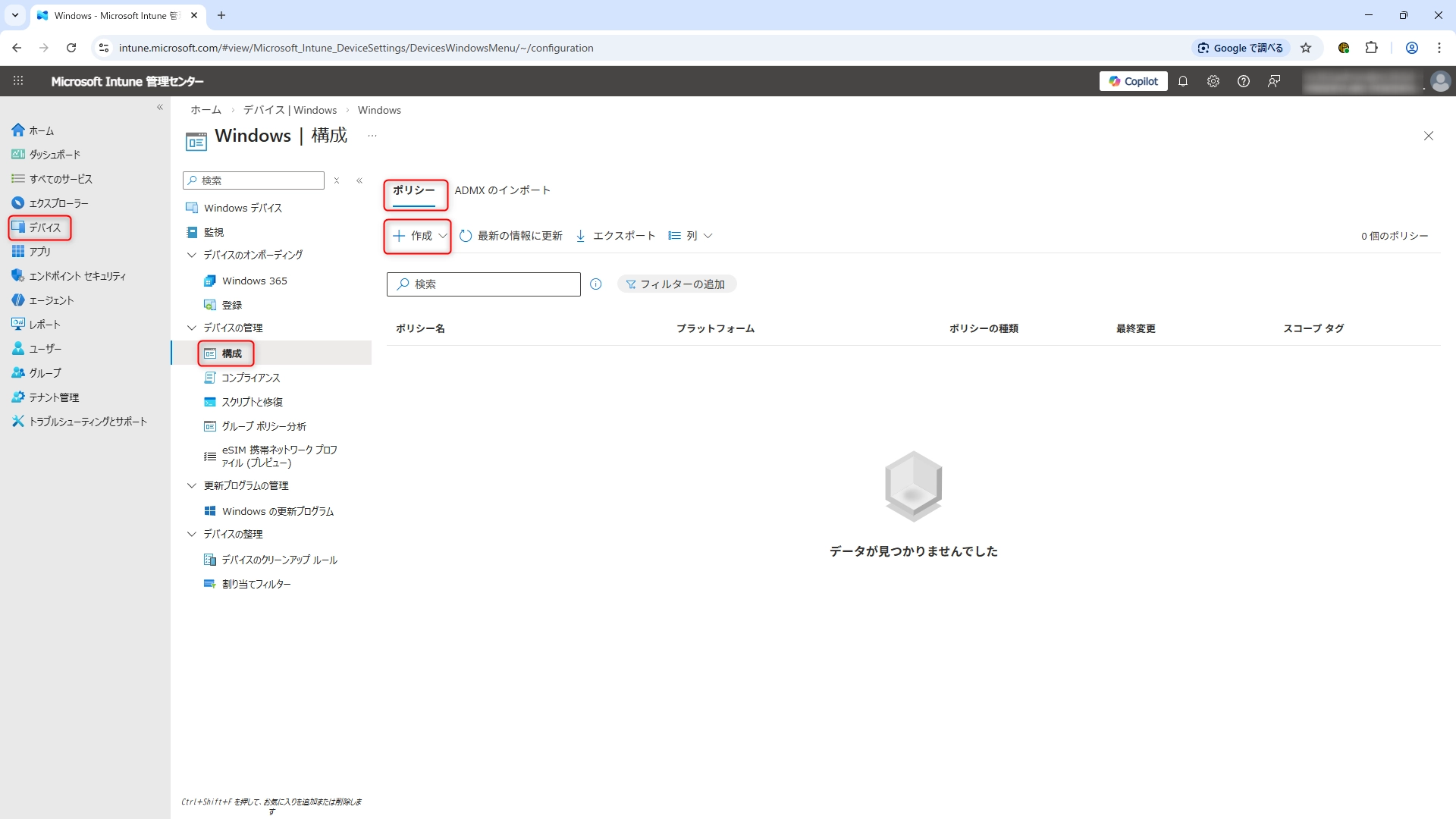 - デバイス >(プラットフォーム別)Windows > (デバイスの管理)構成 > ポリシー > 作成 > 新しいポリシー をクリックします。