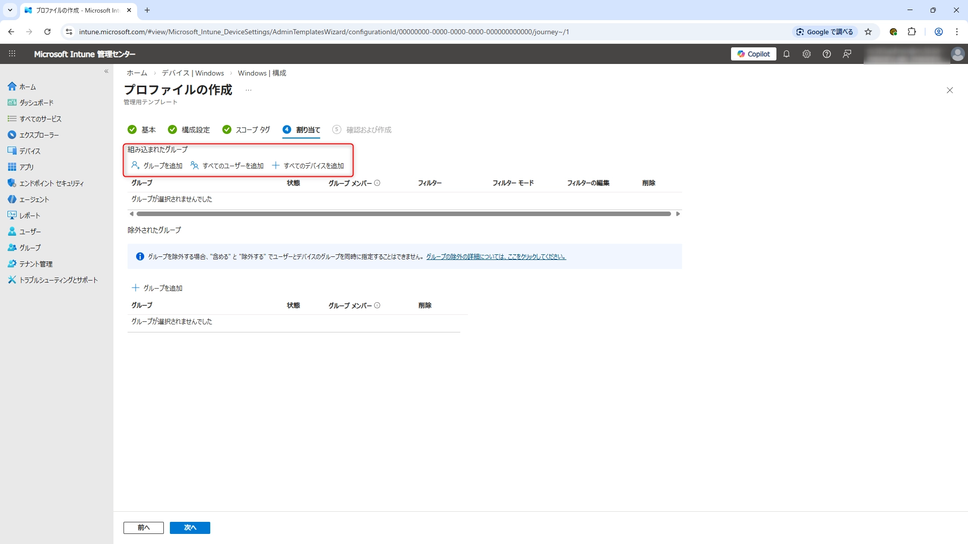 割り当ての画面となりましたら、組み込まれたグループを設定をして「次へ」をクリックします。(必要に応じて除外されたグループも設定してください)