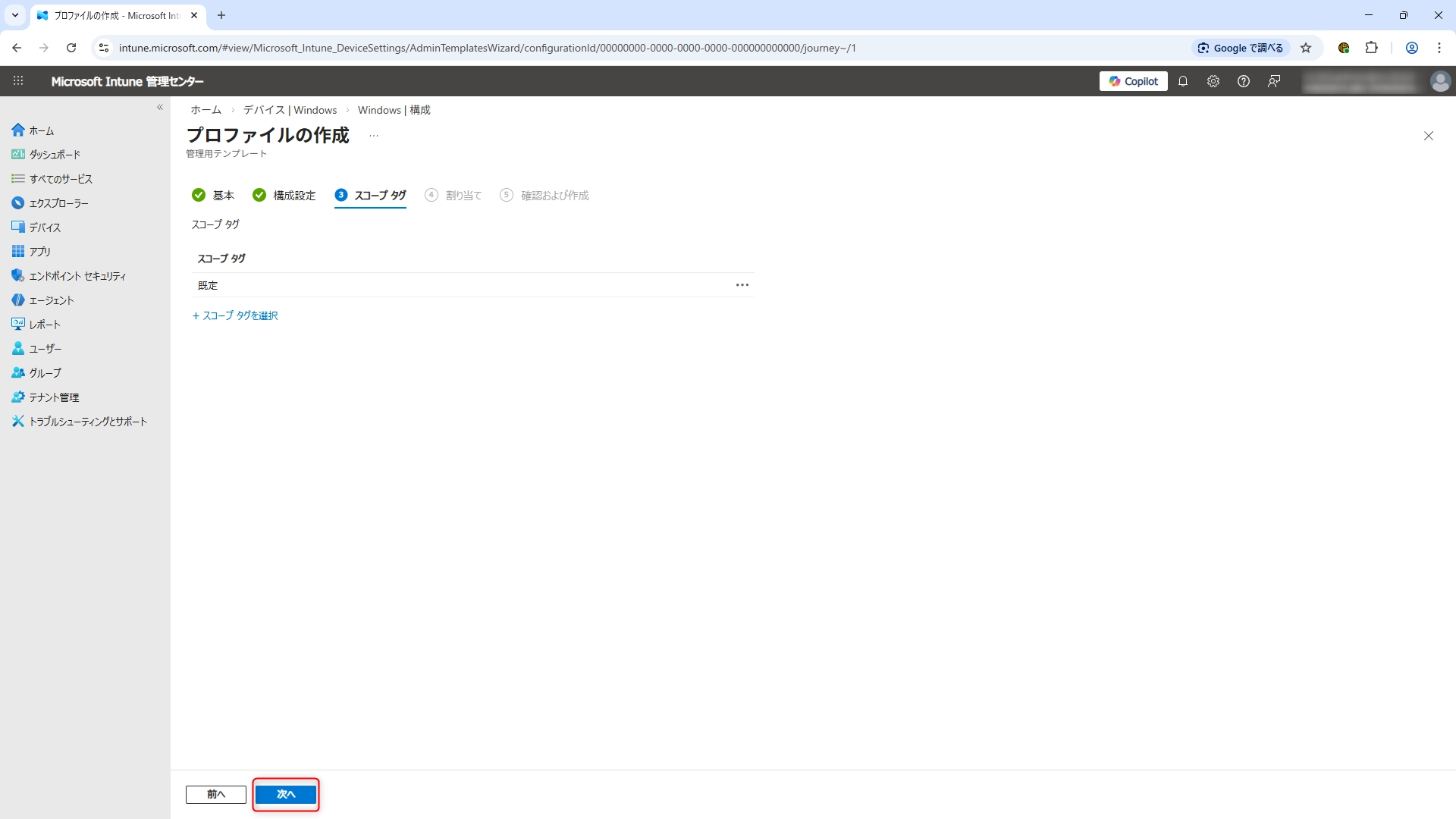 スコープタグの画面となりましたら、お好みによって設定をして「次へ」をクリックします。