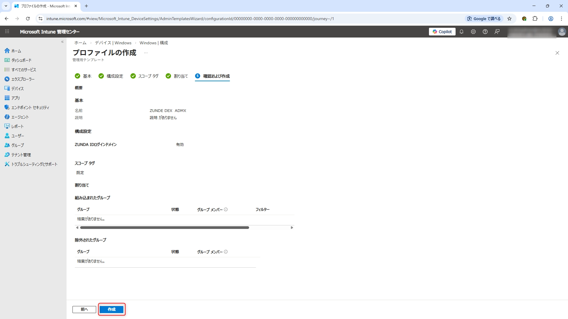 - 確認と作成の画面となりましたら、内容を確認して「作成」をクリックします。
