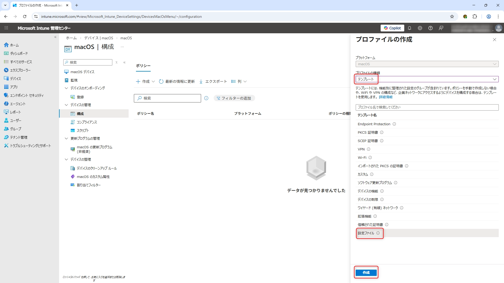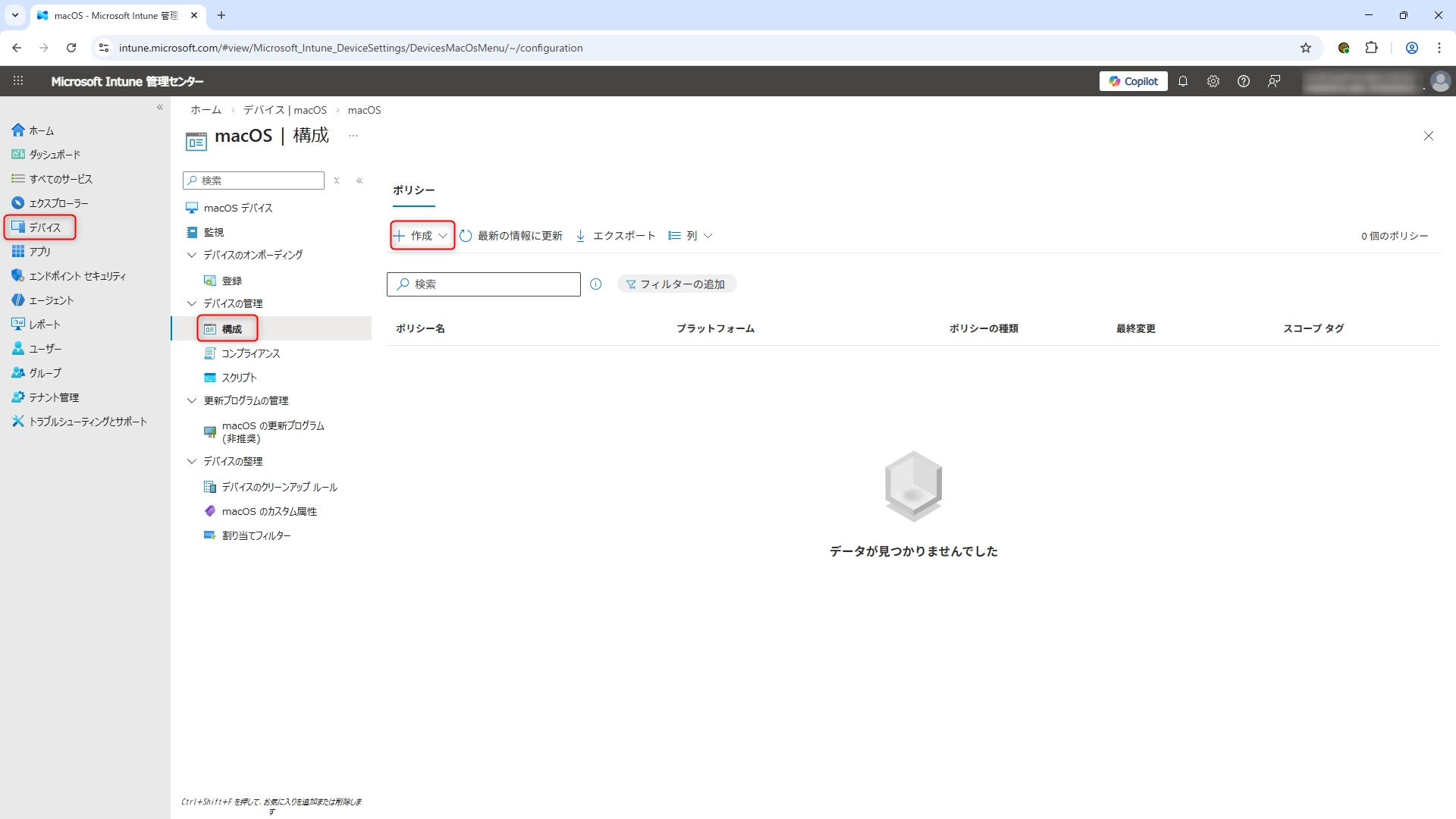 デバイス >(プラットフォーム別)maxOS > (デバイスの管理)構成 > 作成 > 新しいポリシー をクリックします。