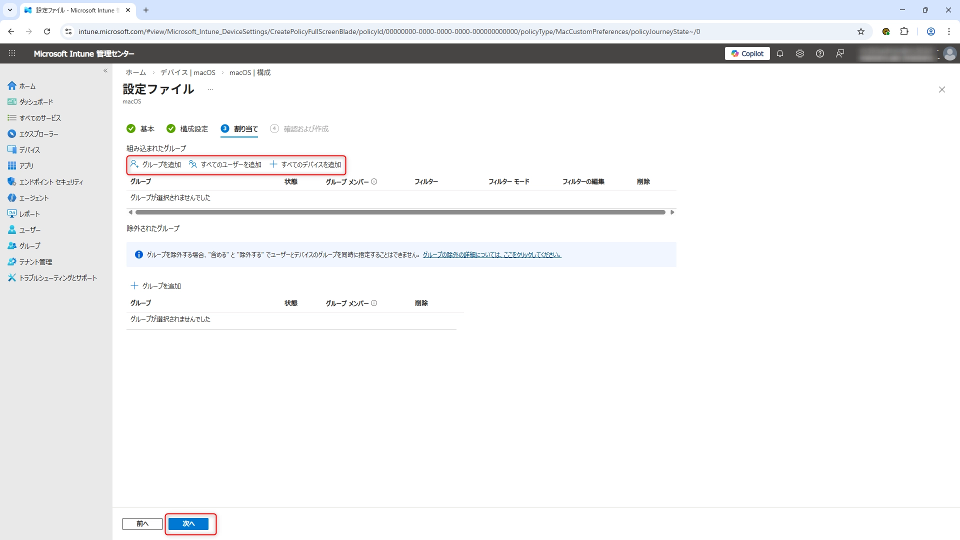 割り当ての画面となりましたら、組み込まれたグループを設定をして「次へ」をクリックします。(必要に応じて除外されたグループも設定してください)