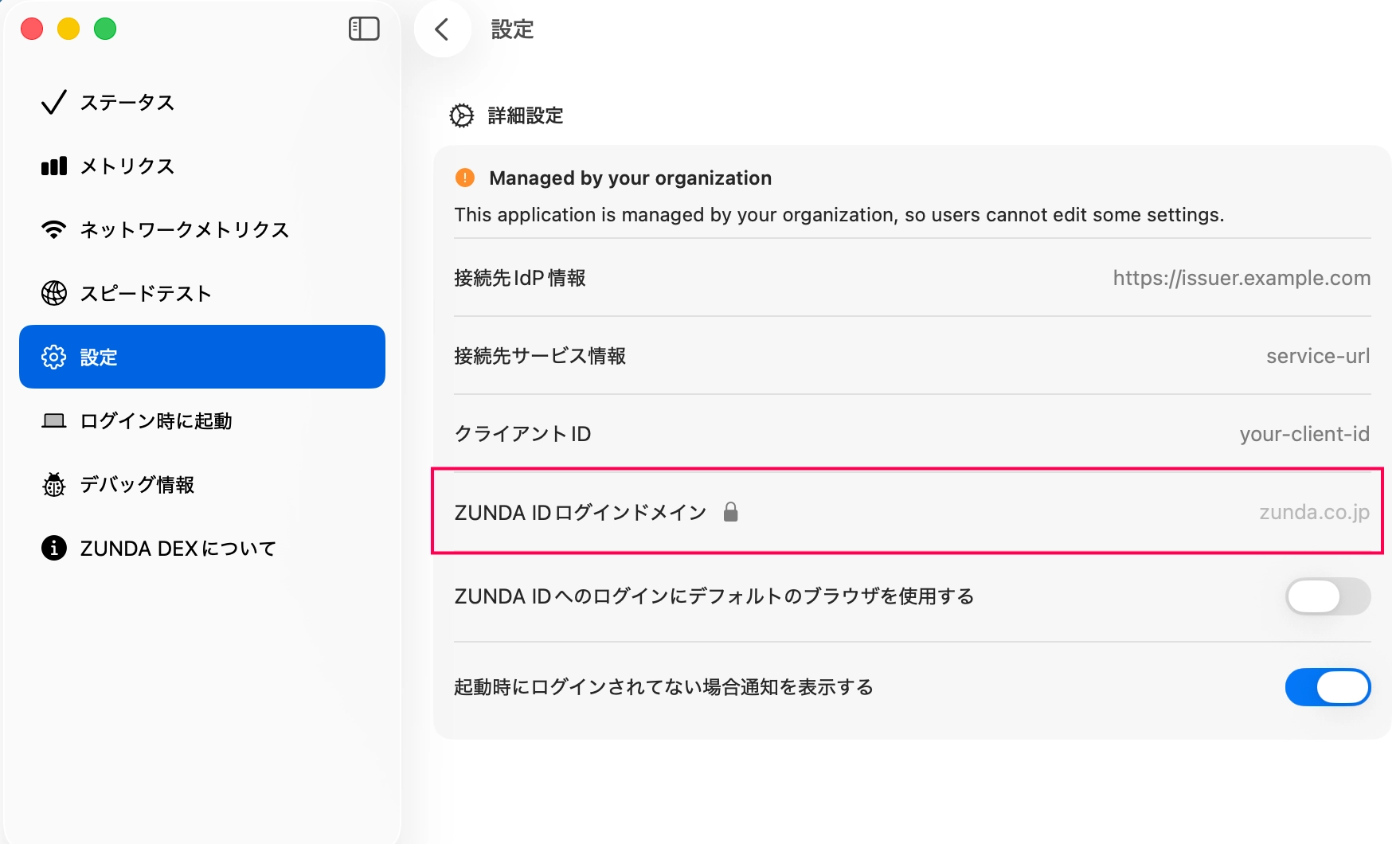 説明: 設定すると、メールアドレスの入力画面を省略し、ZUNDA IDに紐づくSSO(シングルサインオン)プロバイダーの認証画面へ直接遷移させることができます。macOSでは